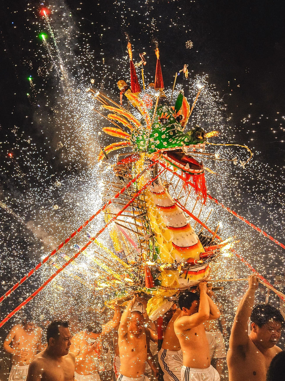 As the liquid metal hits the cool night air, it explodes into thousands of shimmering sparks, raining down like a golden waterfall. Through this "fire rain," the dragon—a long, vibrant creature held aloft by brave, shirtless performers—charges forward, weaving through the heat and light.